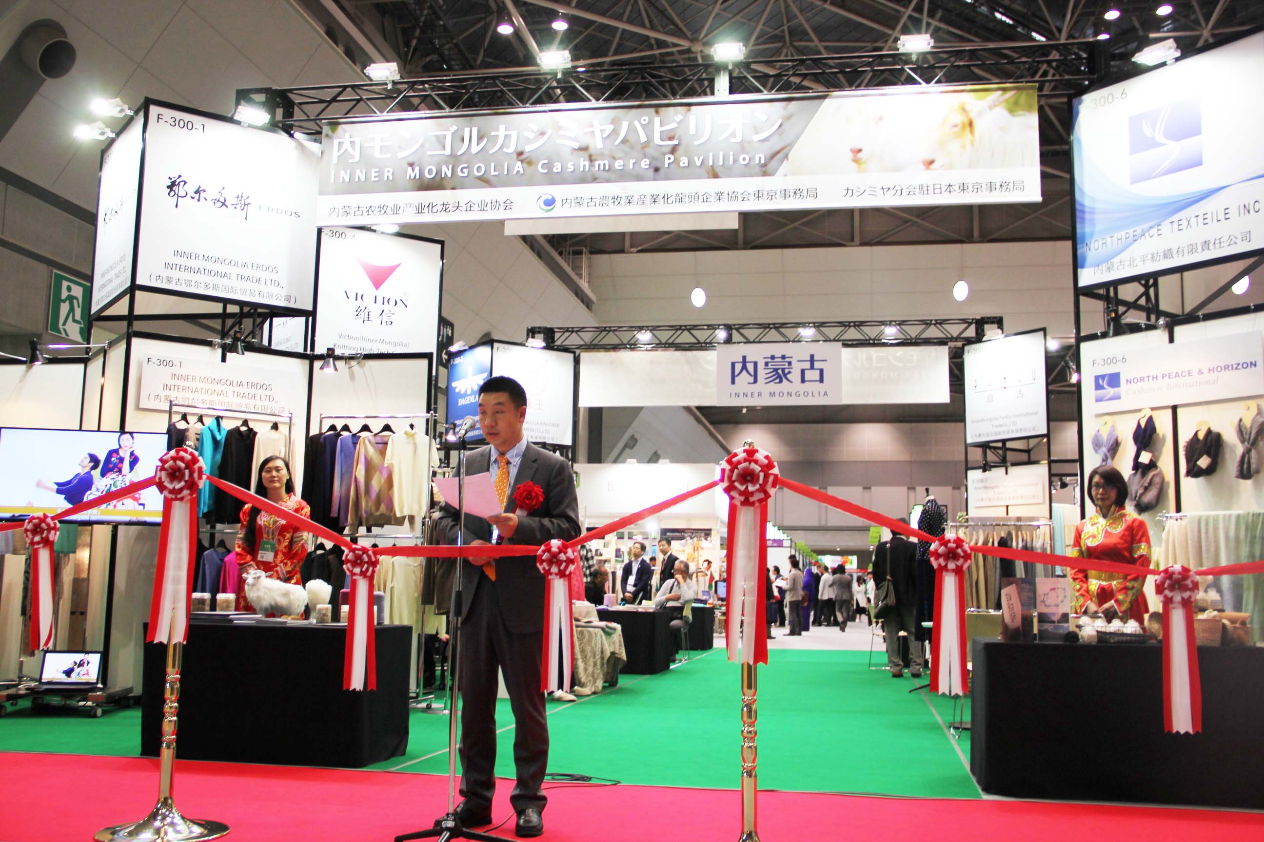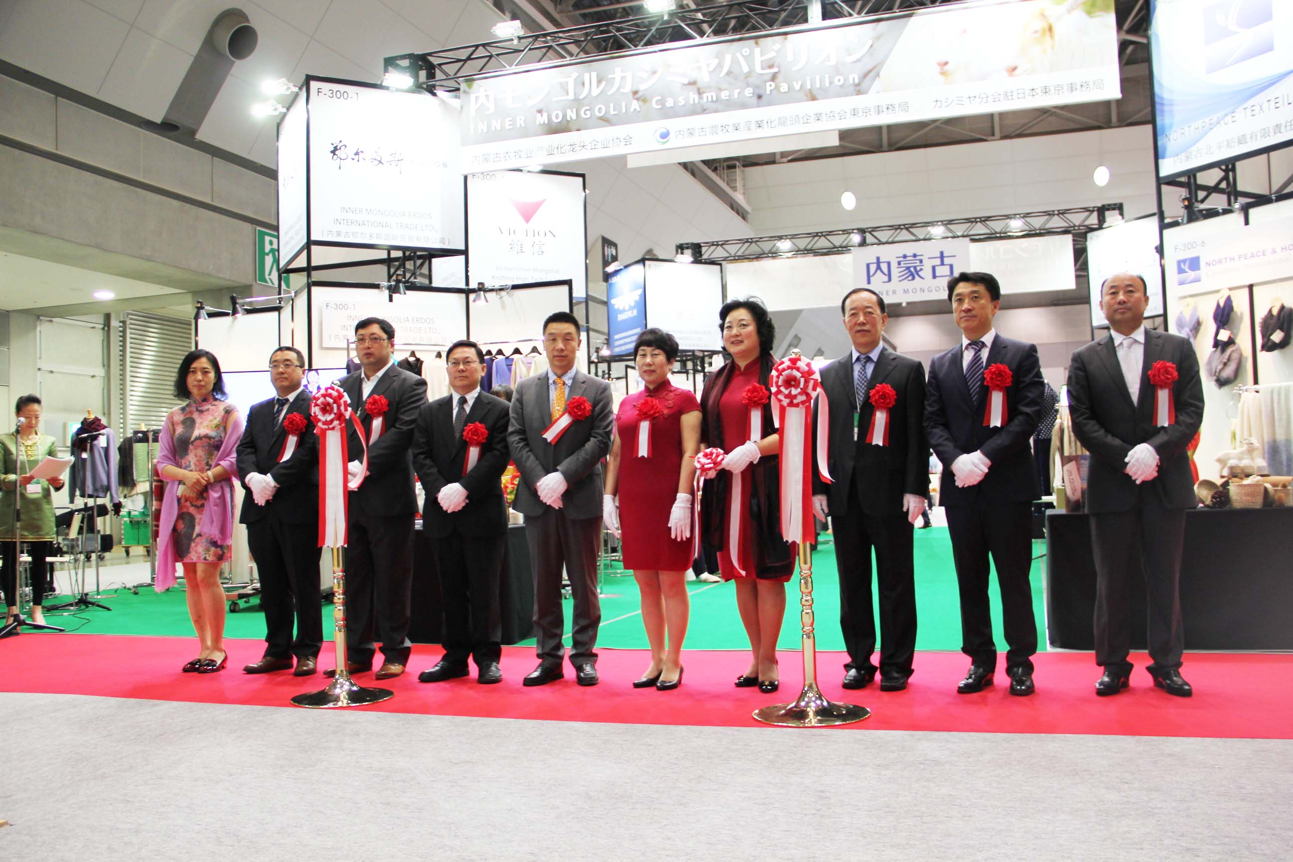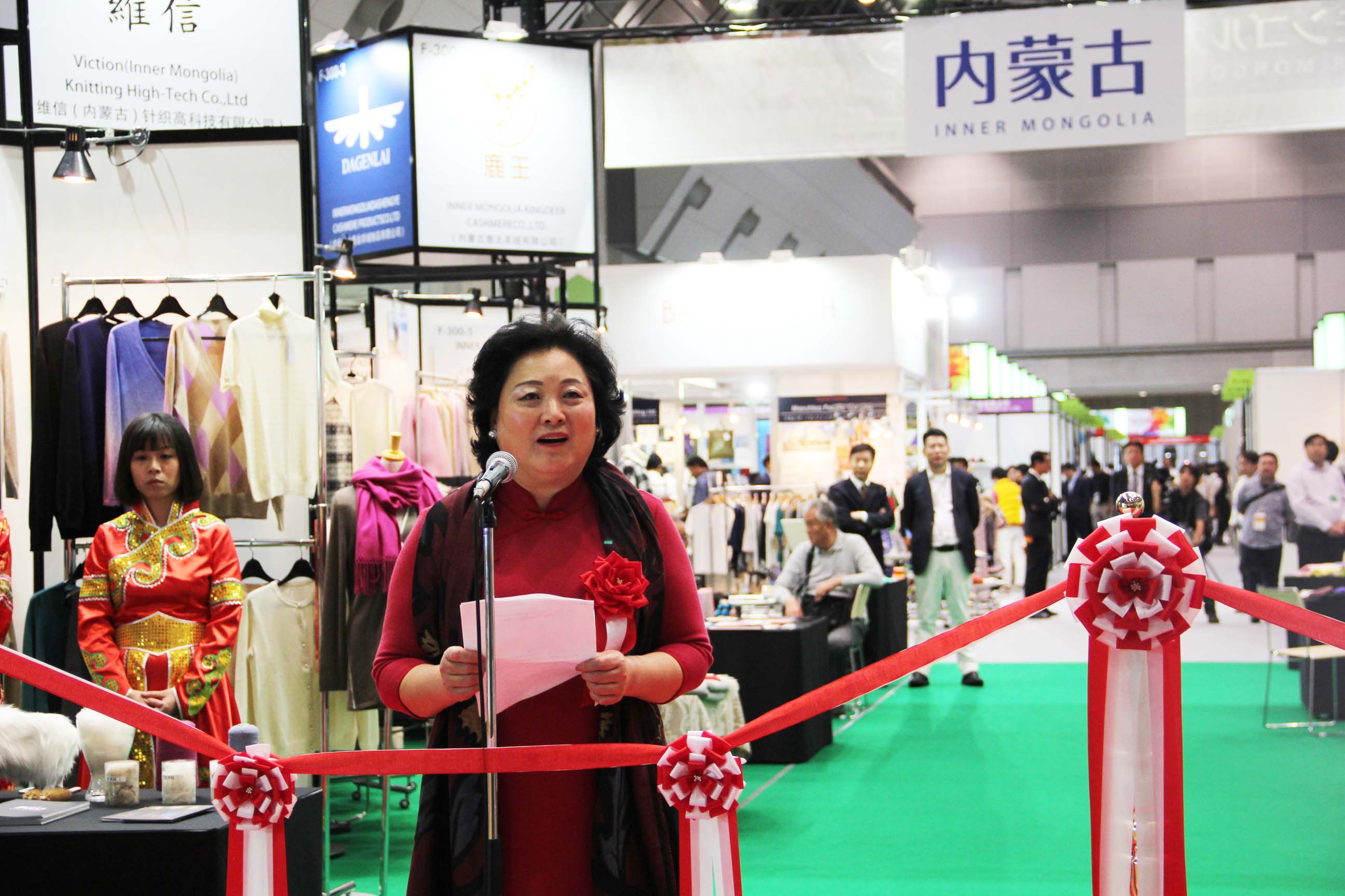 2016426日上午11時(shí),在內蒙古羊絨展區前,舉行了盛大的開(kāi)業(yè)剪彩儀式,內蒙古自治農牧業(yè)廳產(chǎn)業(yè)化處副處長(cháng)郟金梅、內蒙古農牧產(chǎn)業(yè)化龍頭企業(yè)協(xié)會(huì )會(huì )長(cháng)閆樹(shù)春、內蒙古農牧產(chǎn)業(yè)化龍頭企業(yè)協(xié)會(huì )羊絨產(chǎn)業(yè)分會(huì )會(huì )長(cháng)王風(fēng)之出席剪彩儀式,并分別就政府支持、協(xié)會(huì )服務(wù)和企業(yè)自律發(fā)展等幾方面做了精彩致辭。郟金梅副處長(cháng)表示,希望通過(guò)此次活動(dòng),使得社會(huì )各界代表能夠贏(yíng)得機遇、拓展空間,取得豐碩的成果,同時(shí)真誠盼望各方來(lái)賓、新老朋友能夠進(jìn)一步了解內蒙古羊絨,認識內蒙古羊絨,并以此為契機,加強內蒙古羊絨界與日本企業(yè)的合作,攜手發(fā)展,實(shí)現共贏(yíng),共創(chuàng )輝煌。閆樹(shù)春會(huì )長(cháng)在致辭中講到,我們此行不僅是要展示內蒙古羊絨原料優(yōu)勢地位和行業(yè)加工的專(zhuān)業(yè)性,更希望能充分利用各個(gè)平臺廣泛交流,探討合作途徑的契合點(diǎn),推動(dòng)兩國羊絨行業(yè)多方共贏(yíng),共同提升全球市場(chǎng)對羊絨產(chǎn)品的認知度,希望我們的羊絨企業(yè)能團結一致,實(shí)現羊絨產(chǎn)業(yè)的可持續發(fā)展。羊絨產(chǎn)業(yè)分會(huì )會(huì )長(cháng)王風(fēng)之在致辭中表示,通過(guò)內蒙古農牧業(yè)產(chǎn)業(yè)化龍頭企業(yè)協(xié)會(huì )羊絨分會(huì )的平臺,我們勢必會(huì )在培育超細超長(cháng)型產(chǎn)絨山羊、提升優(yōu)質(zhì)種群的規模、建立行業(yè)質(zhì)量標準和抱團發(fā)展,積極進(jìn)行海外市場(chǎng)渠道、品牌、投資等多方面取得突破性進(jìn)展,致力于將中國內蒙古羊絨打造成為全球性的產(chǎn)業(yè)品牌。