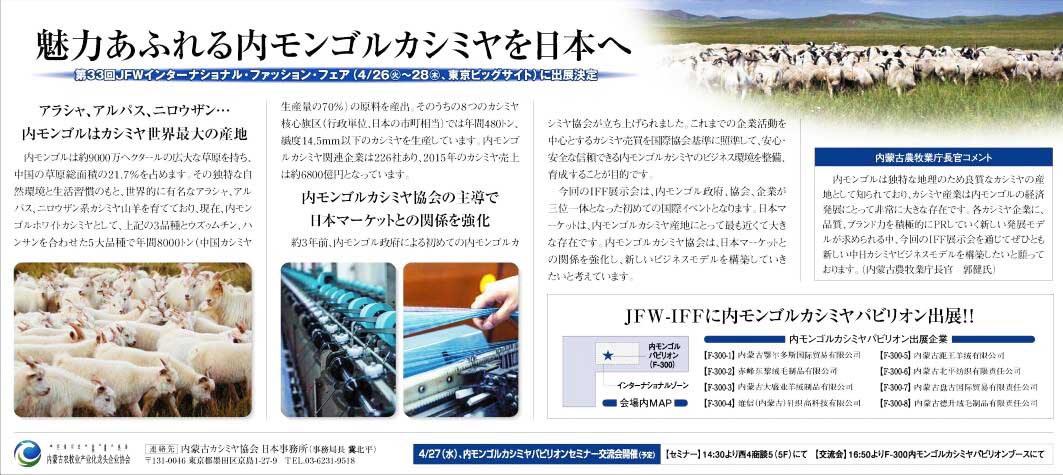 2016419日,內蒙古自治區農牧業(yè)廳廳長(cháng)郭健在IFF報紙上寄語(yǔ)此次活動(dòng),希望自治區羊絨企業(yè)積極推進(jìn)以創(chuàng )新、品質(zhì)、品牌為核心的發(fā)展新模式。充分利用各個(gè)平臺廣泛交流,探討合作途徑,推動(dòng)兩國羊絨行業(yè)多方共贏(yíng),共同提升全球市場(chǎng)對羊絨產(chǎn)品的認知度,希望我們的羊絨企業(yè)能團結一致,實(shí)現羊絨產(chǎn)業(yè)的可持續發(fā)展。通過(guò)這次活動(dòng),走出一條中日羊絨產(chǎn)業(yè)創(chuàng )新之路。