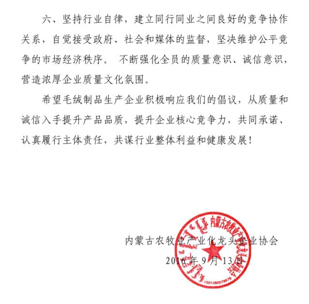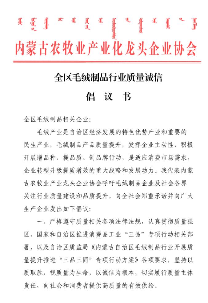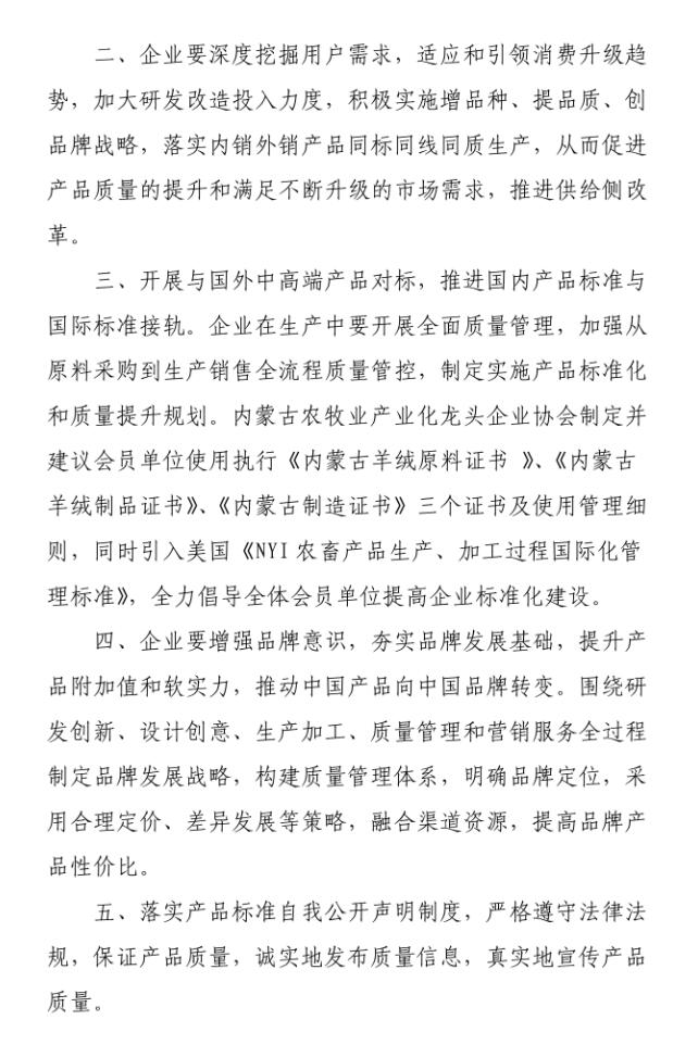 會(huì )上,質(zhì)監局質(zhì)量監督處副處長(cháng)艾繼青宣讀國務(wù)院辦公廳《關(guān)于開(kāi)展消費品工業(yè)“三品”專(zhuān)項行動(dòng)營(yíng)造良好市場(chǎng)環(huán)境的若干意見(jiàn)》;孫磐處長(cháng)向與會(huì )人員通報了近年羊絨監督抽查的質(zhì)量狀況基本情況,并傳達了內蒙古質(zhì)監局印發(fā)的毛絨制品行業(yè)質(zhì)量提升推進(jìn)“三品三同”專(zhuān)項行動(dòng)方案;纖維檢驗局總工程師曹渭芳介紹了纖檢局助力企業(yè)產(chǎn)品質(zhì)量提升檢驗能力的服務(wù)舉措;協(xié)會(huì )副會(huì )長(cháng)、羊絨分會(huì )名譽(yù)會(huì )長(cháng)單位鄂爾多斯羊絨集團,協(xié)會(huì )副會(huì )長(cháng)、內蒙古鹿王羊絨制品有限公司及內蒙古豐蒂妮羊絨制品有限公司三家企業(yè)相關(guān)負責人介紹了各自企業(yè)在落實(shí)國家和自治區羊絨產(chǎn)業(yè)政策、加快企業(yè)轉型升級和產(chǎn)品質(zhì)量提升方面的先進(jìn)經(jīng)驗;內蒙古農牧業(yè)產(chǎn)業(yè)化龍頭企業(yè)協(xié)會(huì )常務(wù)秘書(shū)長(cháng)劉俊青代表行業(yè)協(xié)會(huì )向全區毛絨制品相關(guān)企業(yè)發(fā)起全區毛絨制品行業(yè)誠信倡議書(shū),呼吁毛絨制品企業(yè)從質(zhì)量和誠信入手,提升產(chǎn)品品質(zhì),提升企業(yè)核心競爭力,認真履行責任,共同推進(jìn)行業(yè)整體利益和健康發(fā)展。