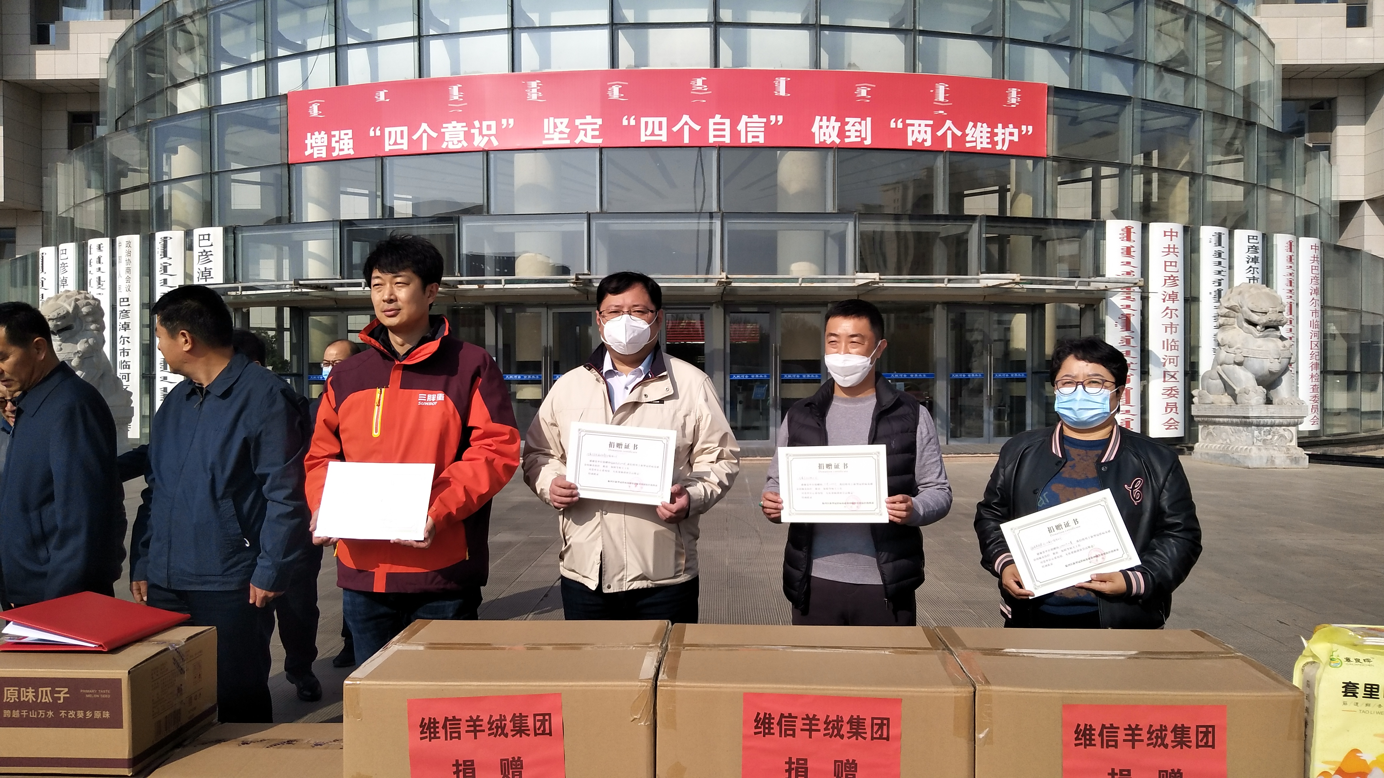 11月5日中午,維信羊絨集團等7家會(huì )員單位向巴彥淖爾市臨河區抗疫捐贈物資,捐贈儀式在臨河區政府辦公樓前舉行,區委副書(shū)記、政法委書(shū)記陳海維參加活動(dòng)并講話(huà),對愛(ài)心企業(yè)的高尚情操給與了高度評價(jià),區政協(xié)副主席劉浩主持了捐贈儀式。