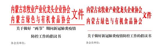 一、內蒙古農牧業(yè)產(chǎn)業(yè)化龍頭企業(yè)協(xié)會(huì )聯(lián)合內蒙古綠色與有機食品協(xié)會(huì ),先后發(fā)布了《關(guān)于做好“兩節”期間新冠肺炎疫情防控工作的倡議書(shū)》和《關(guān)于做好新冠肺炎疫情防控工作的倡議書(shū)》,引導各會(huì )員單位堅決遏止借機囤積居奇、哄抬物價(jià)、虛假宣傳等破壞市場(chǎng)秩序、損害消費者合法權益的不法行為,堅決遏制疫情擴展蔓延,積極投身新型冠狀病毒防控戰役中。
