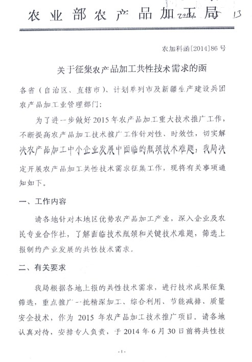 關(guān)于征集農產(chǎn)品加工共性技術(shù)需求的通知