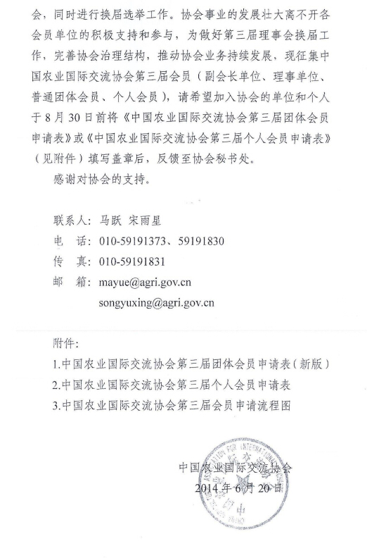 轉發(fā)關(guān)于征集中國農業(yè)國際交流協(xié)會(huì )第三屆會(huì )員的函