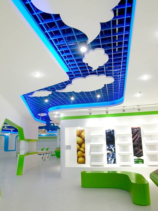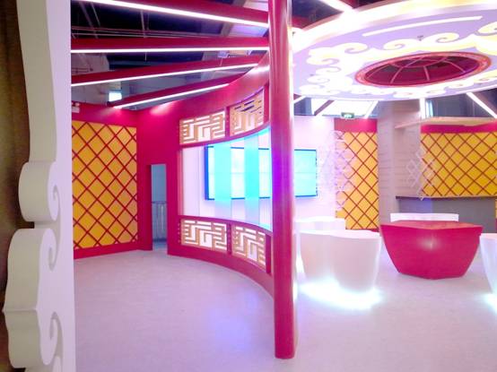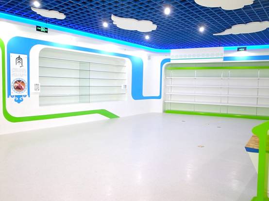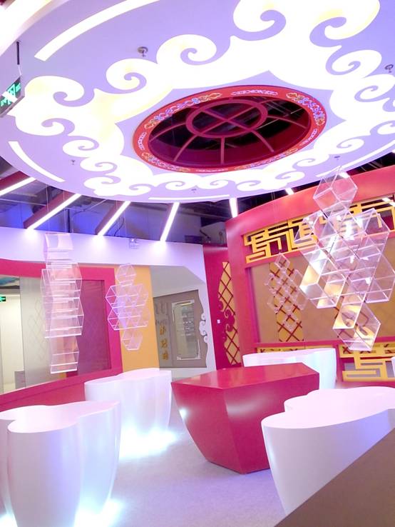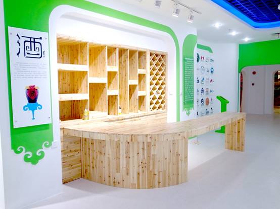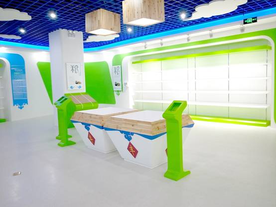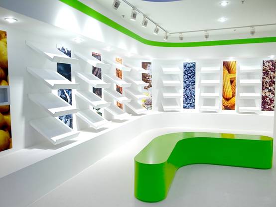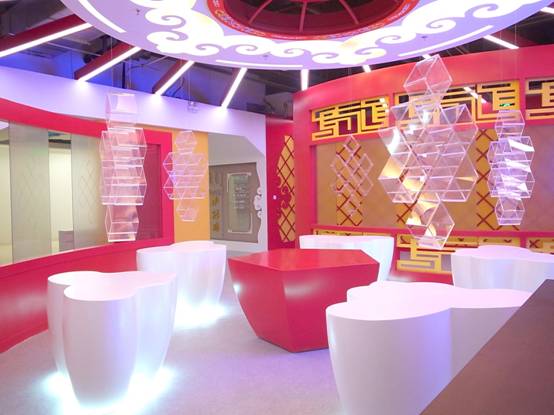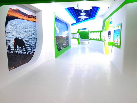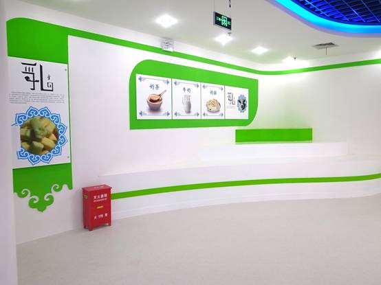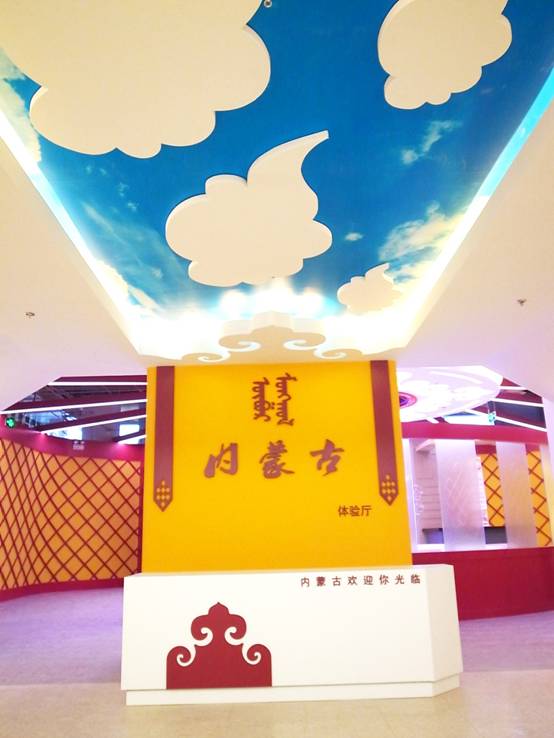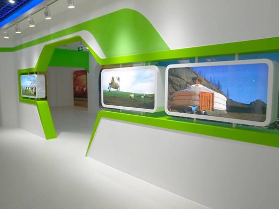 : 上海西郊國際內蒙古館現場(chǎng)實(shí)景圖,現場(chǎng)分為展示區和體驗區,展示區以產(chǎn)品展示銷(xiāo)售為主,現代科技結合時(shí)尚展廳設計風(fēng)格,藍綠白相結合,映襯藍天、白云、草原;體驗區突出體驗品嘗、商務(wù)洽談功能,以現代蒙古包造型設計,突出民族氣息,展現內蒙古特色。