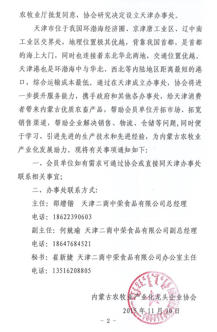 關(guān)于成立內蒙古農牧業(yè)產(chǎn)業(yè)化龍頭企業(yè)協(xié)會(huì )天津辦事處的通知