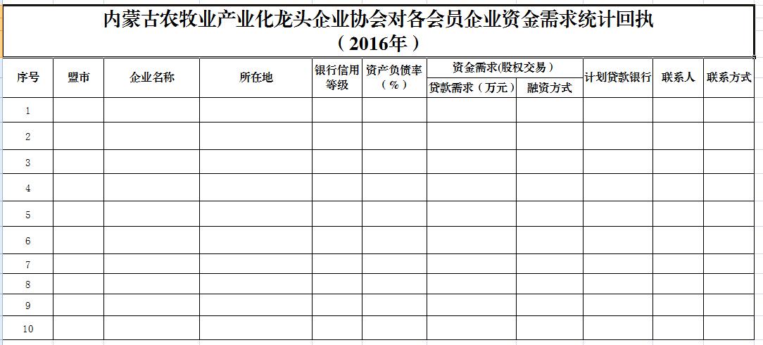內蒙古農牧業(yè)產(chǎn)業(yè)化龍頭企業(yè)協(xié)會(huì )對各會(huì )員企業(yè)資金需求統計回執.xls