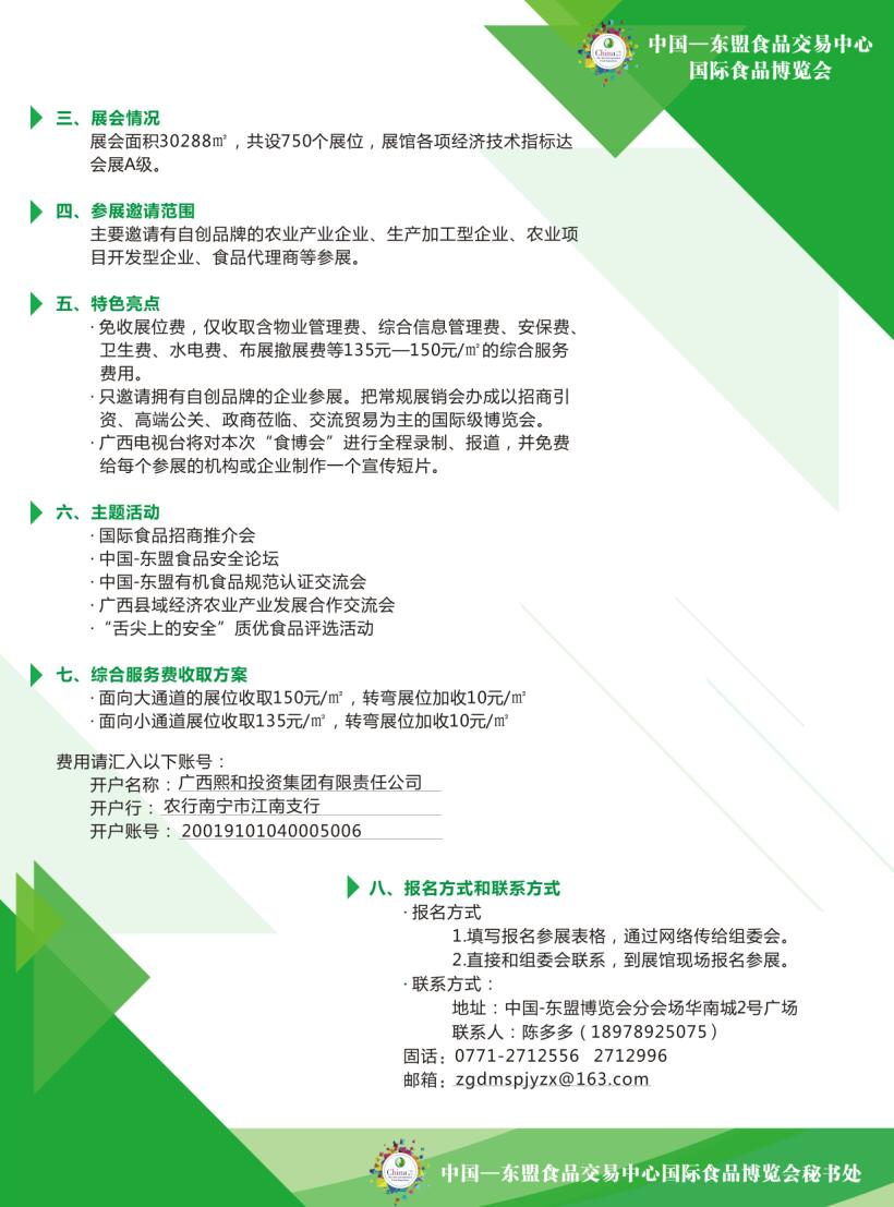 2)本次“博覽會(huì )”將同時(shí)舉辦“首屆中國-東盟食品安全論壇”和
