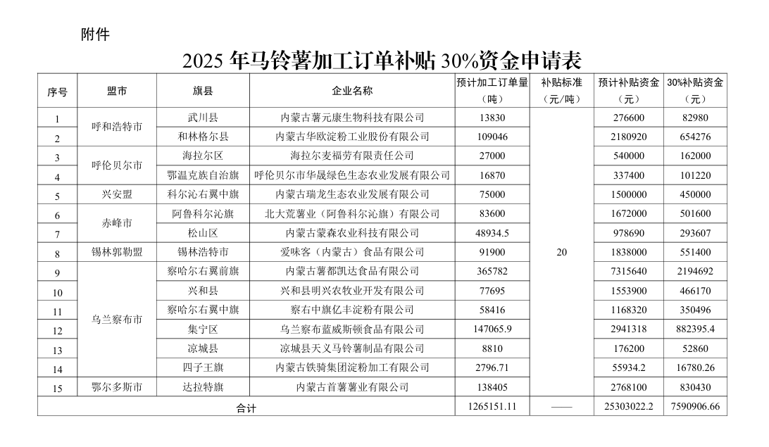 按照《內蒙古自治區農牧廳關(guān)于印發(fā)2025年馬鈴薯加工訂單補貼項目實(shí)施方案的通知》(內農牧加工發(fā)〔2025〕305號)要求,經(jīng)盟市組織申報、實(shí)地核查、公示,自治區復核,現將2025年相關(guān)盟市上報的馬鈴薯加工訂單補貼30%資金申請情況予以公示,公示期為15天。如對公示有異議,請及時(shí)向自治區農牧廳反映。
